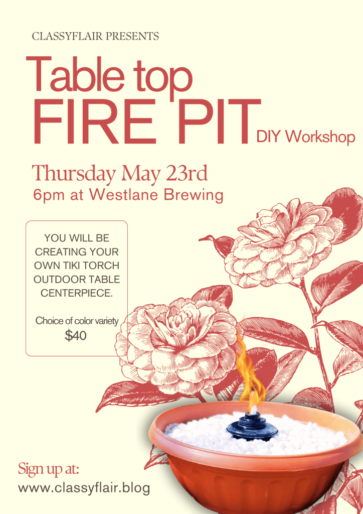 Workshop includes large centerpiece bowl with refillable tiki torch and filling stones. You will have the opportunity to add your own style to this centerpiece.