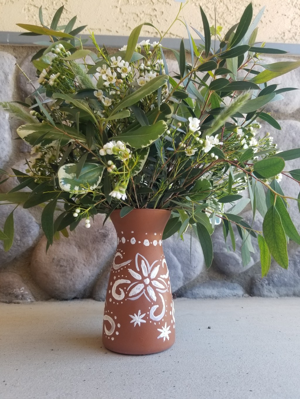 We will first doodle paint a terracotta-colored glass vase and then be taught how to design a greenery floral arrangement.