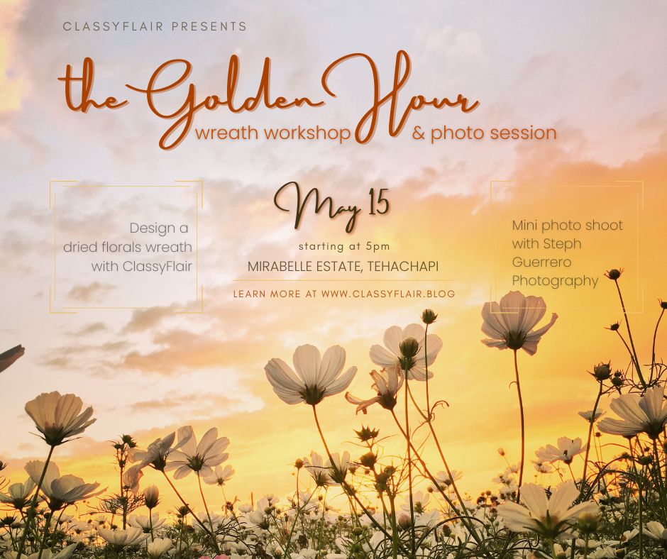 We will be designing beautiful, everlasting dried floral wreathes, along with individual mini photo sessions during “the golden hour”, when the sunset is just right.