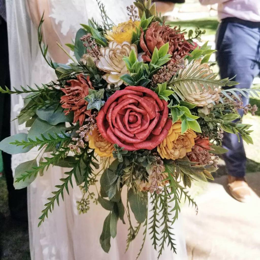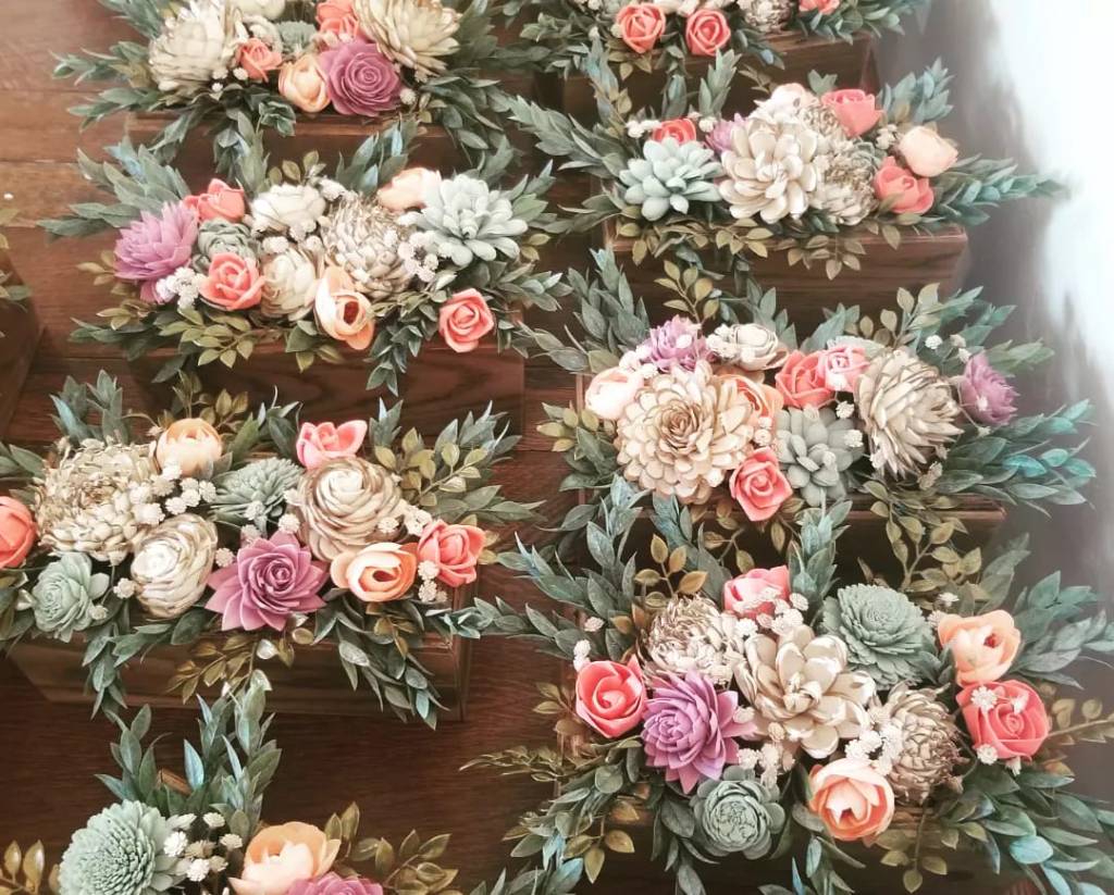 This design was curated with the bride’s cake colors and florals in mind. These table centerpieces were arranged in custom built oak wood boxes. The ultimate barnwood country design.